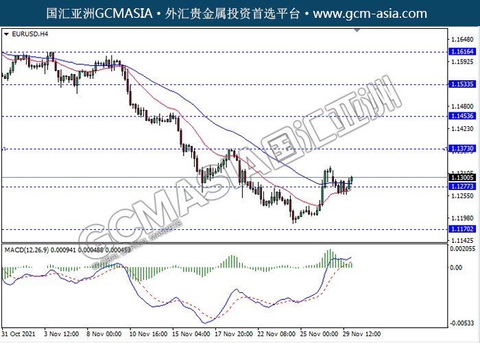 20211130 EURUSD-午间 by willy | Nov 30, 2021 | 欧元兑美元 | 0 comments EURUSD,H4: 欧美触底反弹上行。MACD高位承压回落,若突破可继续看空为主。上方关注1.1375压力和1.1455压力,下方关注1.1275支撑和1.1170支撑。