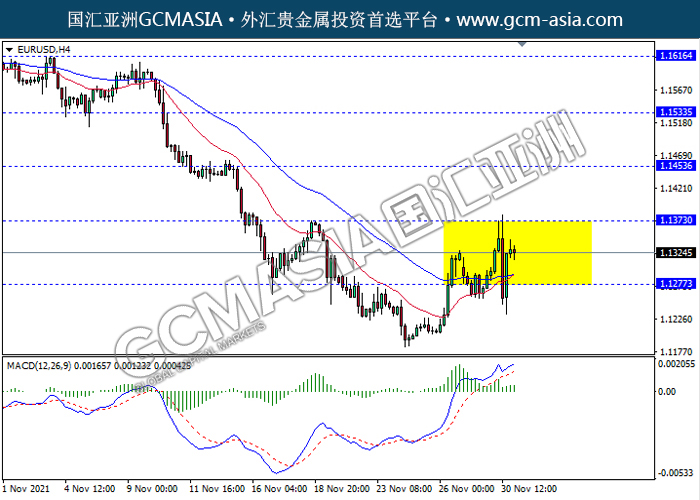 20211201 EURUSD-午间 by keyk | Dec 1, 2021 | 欧元兑美元 | 0 comments EURUSD,H4: 欧美区间震荡交易。然而,MACD显示多头信号,动能略增,若突破压力可关注多头方向为主。上方关注1.1375压力和1.1455压力,下方关注1.1275支撑和1.1170支撑。