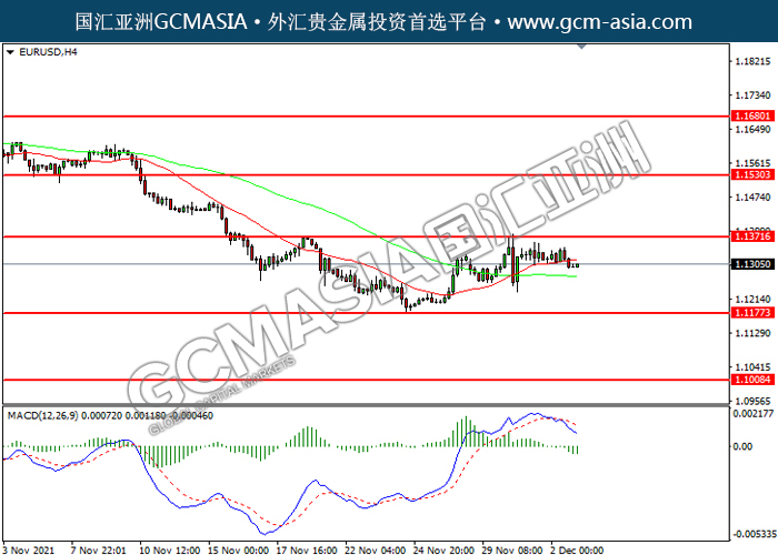 20211203 EURUSD by willy | Dec 3, 2021 | 欧元兑美元 | 0 comments EURUSD,H4: 欧美震荡下行。MACD空头动能略增,短期可关注空头为主。上方关注1.1370压力和1.1530压力,下方关注1.1175支撑和1.1010支撑。