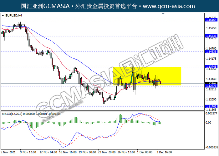 20211206 EURUSD-午间 by keyk | Dec 6, 2021 | 欧元兑美元 | 0 comments EURUSD,H4: 欧美仍区间震荡交易,目前测试靠近前期支撑。然而,MACD显示空头信号,动能持续略减,若突破可继续看空为主。上方关注1.1375压力和1.1455压力,下方关注1.1275支撑和1.1170支撑。