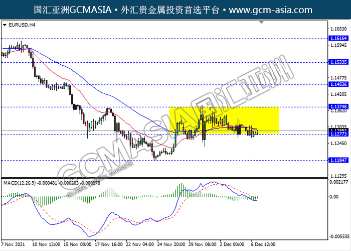 20211207 EURUSD-午间 by keyk | Dec 7, 2021 | 欧元兑美元 | 0 comments EURUSD,H4: 欧美仍区间震荡交易,目前测试靠近前期支撑。然而,MACD显示空头信号,空头动能略减,短期关注多头反弹趋势为主。上方关注1.1375压力和1.1455压力,下方关注1.1275支撑和1.1185支撑。