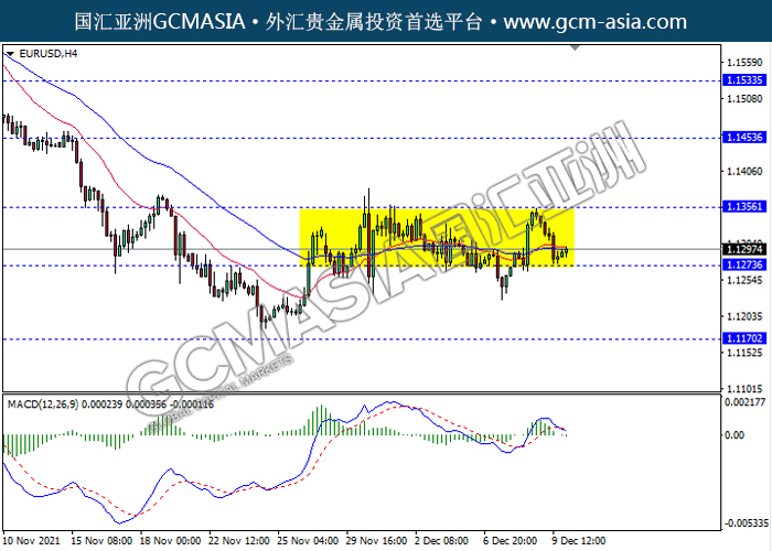 20211210 EURUSD-午间 by keyk | Dec 10, 2021 | 欧元兑美元 | 0 comments EURUSD,H4: 欧美区间震荡盘整,目前测试靠近前期支撑。然而,MACD形成死叉,动能略减,若突破可关注空头方向为主。上方关注1.1355压力和1.1455压力,下方关注1.1275支撑和1.1170支撑。