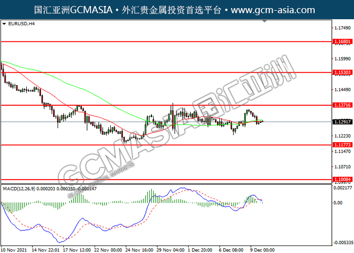20211210 EURUSD by willy | Dec 10, 2021 | 欧元兑美元 | 0 comments EURUSD,H4: 欧美震荡下行。MACD空头动能略增,短期可关注空头为主。上方关注1.1370压力和1.1530压力,下方关注1.1175支撑和1.1010支撑。