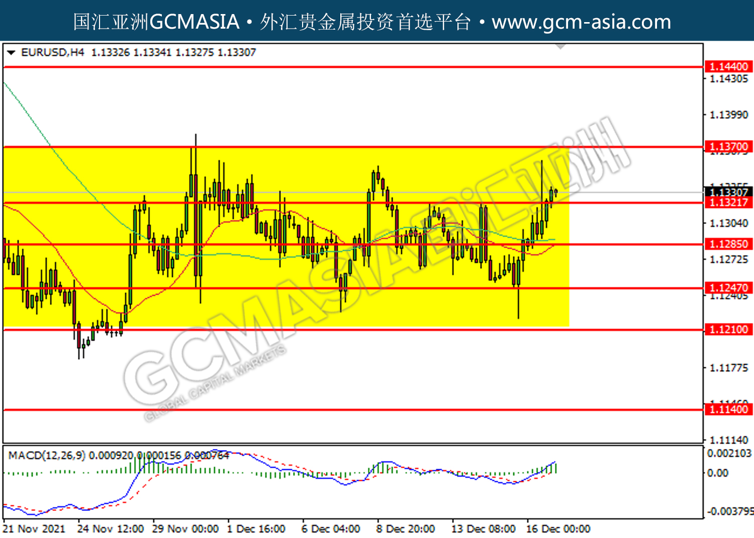 EURUSD,H4:欧美震荡上行。MACD多头动能有所略增,短期关注多头势力为主。上方关注1.1370压力和1.1440压力,下方关注1.1320支撑和1.1285支撑。