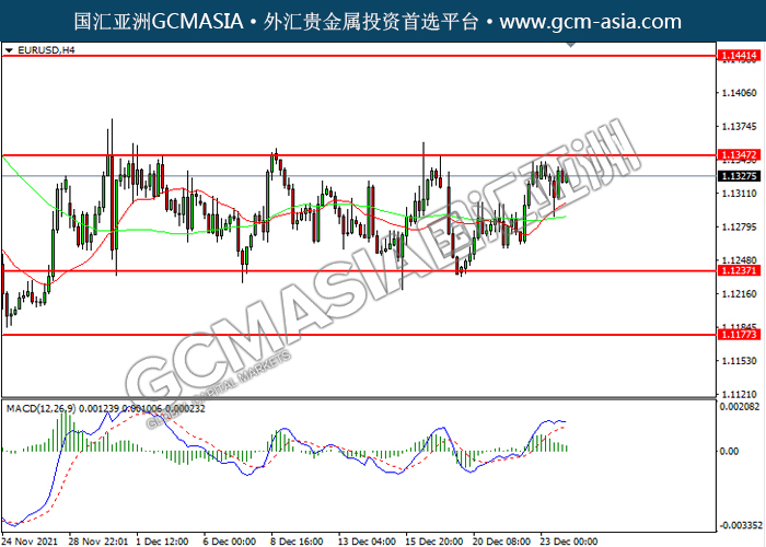 20211224 EURUSD-午间 by willy | Dec 24, 2021 | 欧元兑美元 | 0 comments EURUSD,H4: 欧美震荡上行,目前测试前期压力。然而,MACD多头动能略减,短期可关注技术性回调为主。上方关注1.1345压力和1.1440压力,下方关注1.1235支撑和1.1175支撑。