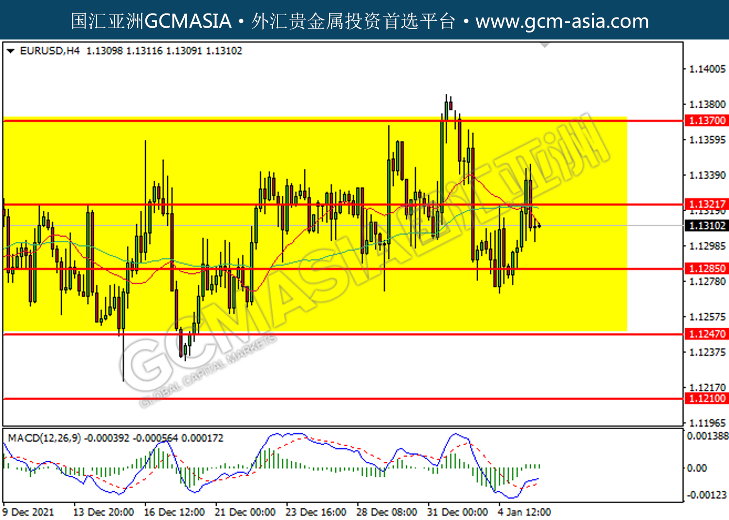 20220106 EURUSD by willy | Jan 6, 2022 | 欧元兑美元 | 0 comments EURUSD,H4:欧美受承压回落。MACD多头动能有所略减,短期关注空头势力为主。上方关注1.1320压力和1.1370压力,下方关注1.1285支撑和1.1250支撑。