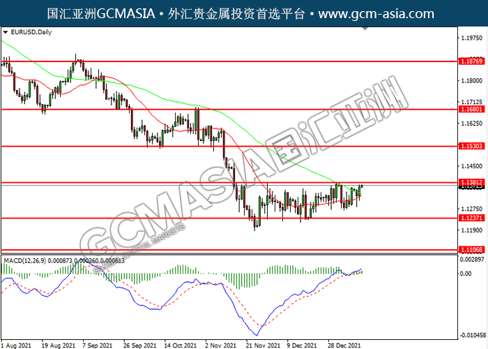 EURUSD,Daily: 欧美震荡上行,目前测试前期压力。 MACD多头动能略增,若突破可关注多头为主。上方关注1.1380压力和1.1530压力,下方关注1.1235支撑和1.1105支撑。