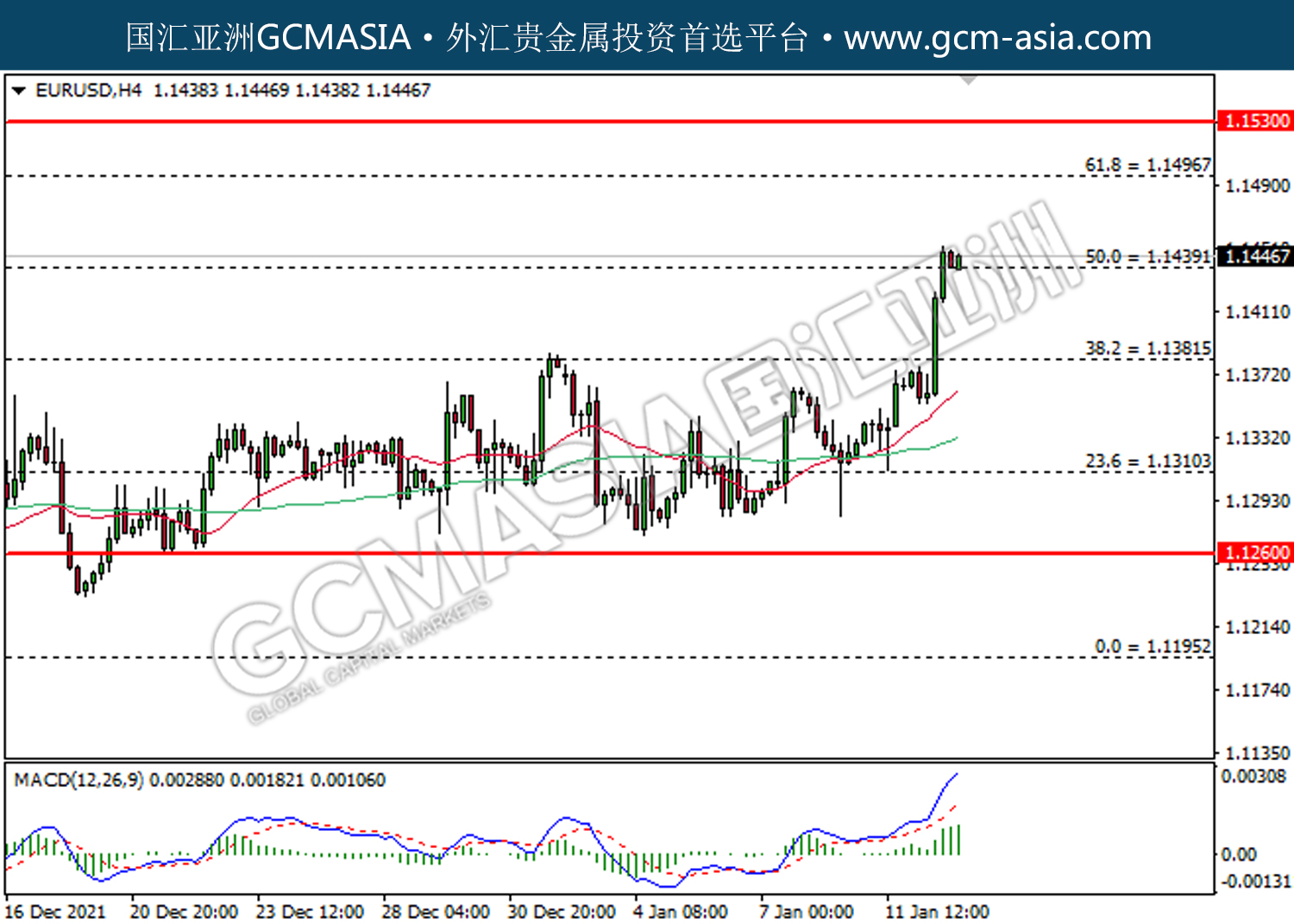 20220113 EURUSD by willy | Jan 13, 2022 | 欧元兑美元 | 0 comments EURUSD,H4:欧美低位反弹。MACD开始形成金叉,动能转强,短期关注多头势力为主。上方关注1.1495压力和1.1530压力,下方关注1.1440支撑和1.1380支撑。