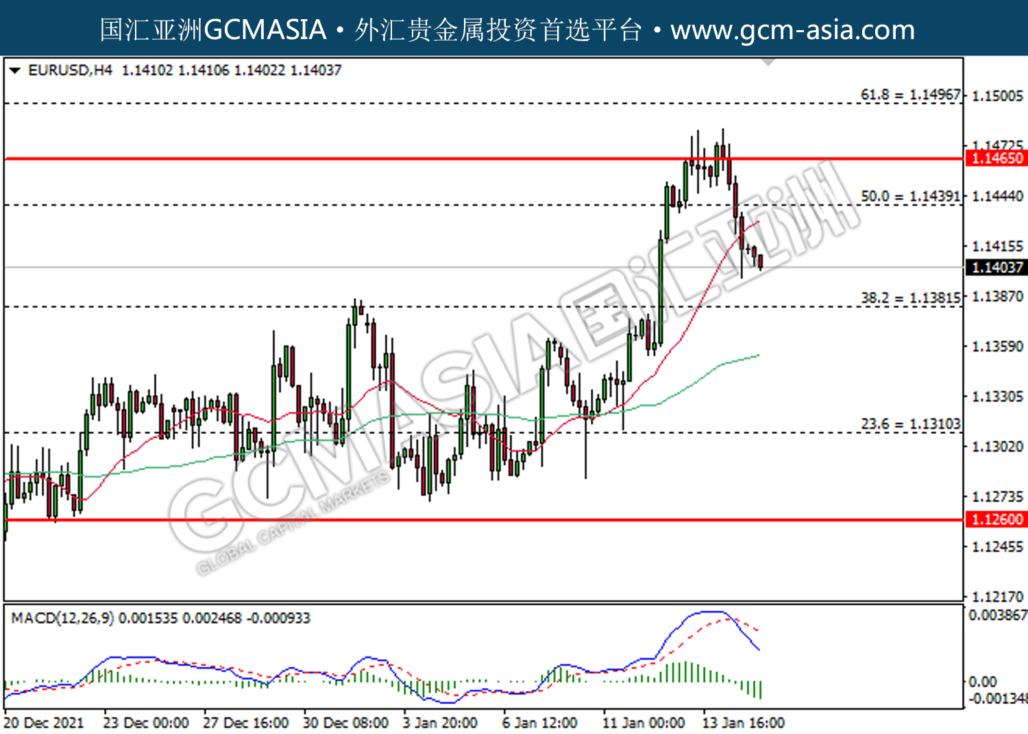20220117 EURUSD by willy | Jan 17, 2022 | 欧元兑美元 | 0 comments EURUSD,H4:欧美受承压回落。MACD已形成死叉,动能转弱,短期关注空头势力为主。上方关注1.1440压力和1.1465压力,下方关注1.1380支撑和1.1310支撑。
