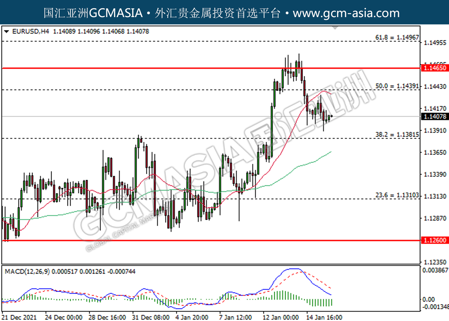20220118 EURUSD by willy | Jan 18, 2022 | 欧元兑美元 | 0 comments EURUSD,H4:欧美受承压回落。MACD已形成死叉,动能转弱,短期关注空头势力为主。上方关注1.1440压力和1.1465压力,下方关注1.1380支撑和1.1310支撑。