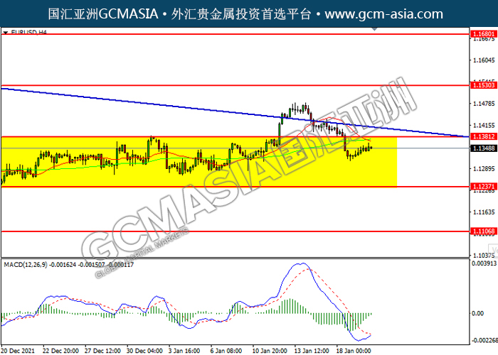 20220120 EURUSD-午间 by willy | Jan 20, 2022 | 欧元兑美元 | 0 comments EURUSD,H4: 欧美高位回落。 MACD空头动能略增,短期可关注空头为主。上方关注1.1380压力和1.1530压力,下方关注1.1235支撑和1.1105支撑。