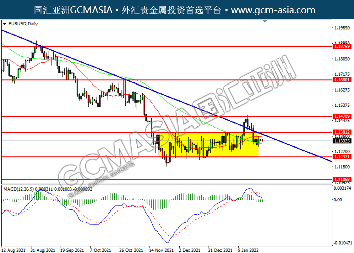 20220124 EURUSD-午间 by willy | Jan 24, 2022 | 欧元兑美元 | 0 comments EURUSD,Daily: 欧美高位回落。 MACD空头动能略增,短期可关注空头为主。上方关注1.1380压力和1.1530压力,下方关注1.1235支撑和1.1105支撑。