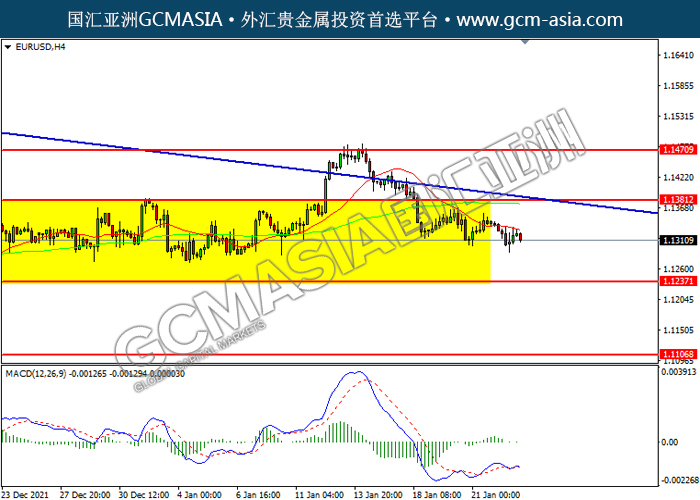 20220125 EURUSD-午间 by willy | Jan 25, 2022 | 欧元兑美元 | 0 comments EURUSD,H4: 欧美高位回落。 MACD空头动能略增,短期可关注空头为主。上方关注1.1380压力和1.1530压力,下方关注1.1235支撑和1.1105支撑。