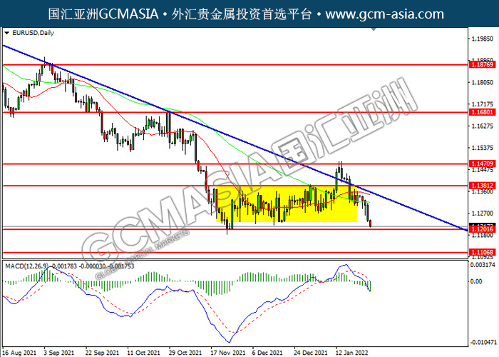 20220127 EURUSD-午间 by willy | Jan 27, 2022 | 欧元兑美元 | 0 comments EURUSD,Daily: 欧美高位回落,目前测试前期支撑。 MACD空头动能略增,若下破可关注空头为主。上方关注1.1380压力和1.1470压力,下方关注1.1200支撑和1.1105支撑。