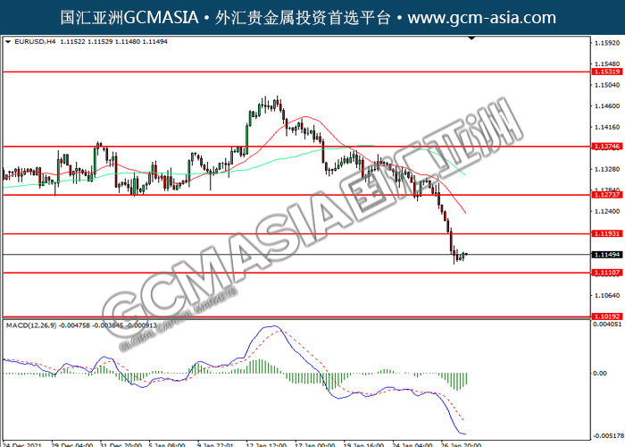 20220128 EURUSD-午间 by willy | Jan 28, 2022 | 欧元兑美元 | 0 comments EURUSD,H4:欧美受承压回落。然而,MACD空头动能略减,短期关注技术性回调为主。上方关注1.1195压力和1.1275压力,下方关注1.1110支撑和1.1020支撑。