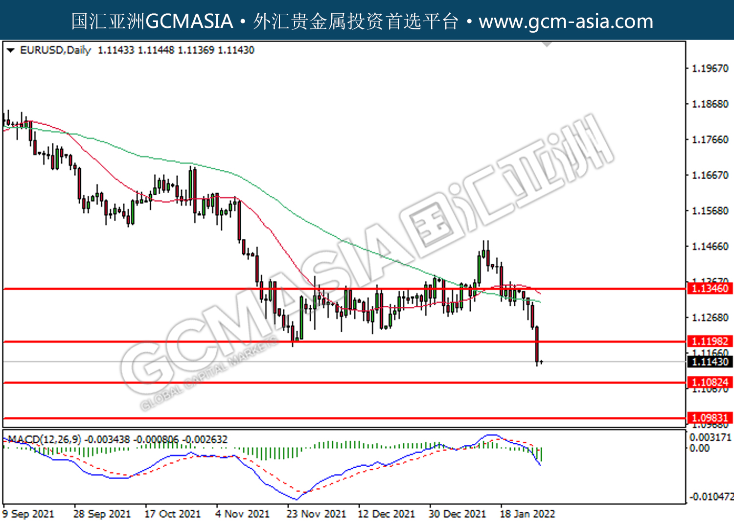 20220128 EURUSD by willy | Jan 28, 2022 | 欧元兑美元 | 0 comments EURUSD,Daily:欧美受承压回落。MACD已形成死叉,动能转弱,短期关注空头势力为主。上方关注1.1200压力和1.1345压力,下方关注1.1080支撑和1.0985支撑。