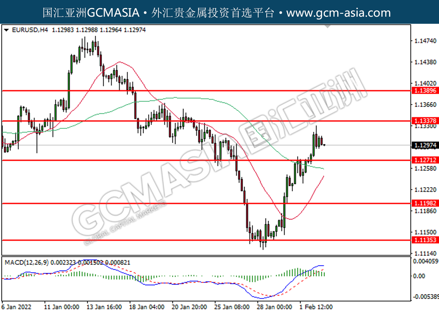 EURUSD,H4:欧美受承压回落。MACD多头动能有所略减,短期关注空头势力。上方关注1.1340压力和1.1390压力,下方关注1.1270支撑和1.1200支撑。