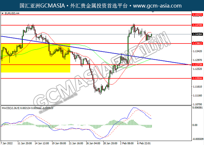 20220209 EURUSD-午间 by willy | Feb 9, 2022 | 欧元兑美元 | 0 comments EURUSD, H4: 欧美高位回落。MACD空头动能略增,短期可关注空头为主。上方关注1.1475压力和1.1525压力,下方关注1.1380支撑和1.1275支撑。