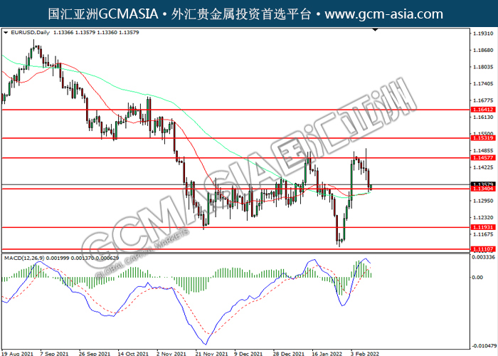 20220214 EURUSD by willy | Feb 14, 2022 | 欧元兑美元 | 0 comments EURUSD,Daily:欧美震荡下行。MACD已形成死叉,动能转弱,若下破可继续看空。上方关注1.1455压力和1.1530压力,下方关注1.1340支撑和1.1195支撑。