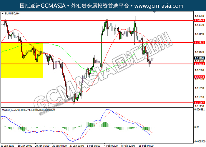 20220215 EURUSD-午间 by willy | Feb 15, 2022 | 欧元兑美元 | 0 comments EURUSD, H4: 欧美高位回落,目前测试前期支撑。MACD空头动能略减,短期可关注多头为主。上方关注1.1380压力和1.1475压力,下方关注1.1290支撑和1.1235支撑。