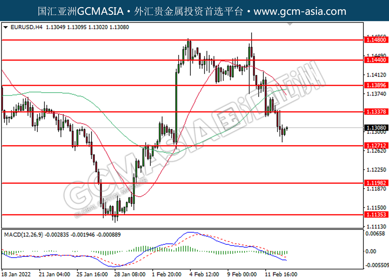 20220215 EURUSD by willy | Feb 15, 2022 | 欧元兑美元 | 0 comments EURUSD,H4:欧美低位反弹。MACD空头动能有所略减,短期关注多头势力为主。上方关注1.1340压力和1.1390压力,下方关注1.1270支撑和1.1200支撑。