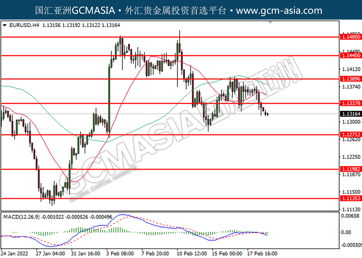 20220221 EURUSD by willy | Feb 21, 2022 | 欧元兑美元 | 0 comments EURUSD,H4:欧美受承压回落。MACD已形成死叉,动能转弱,短期关注空头为主。上方关注1.1340压力和1.1390压力,下方关注1.1270支撑和1.1200支撑。