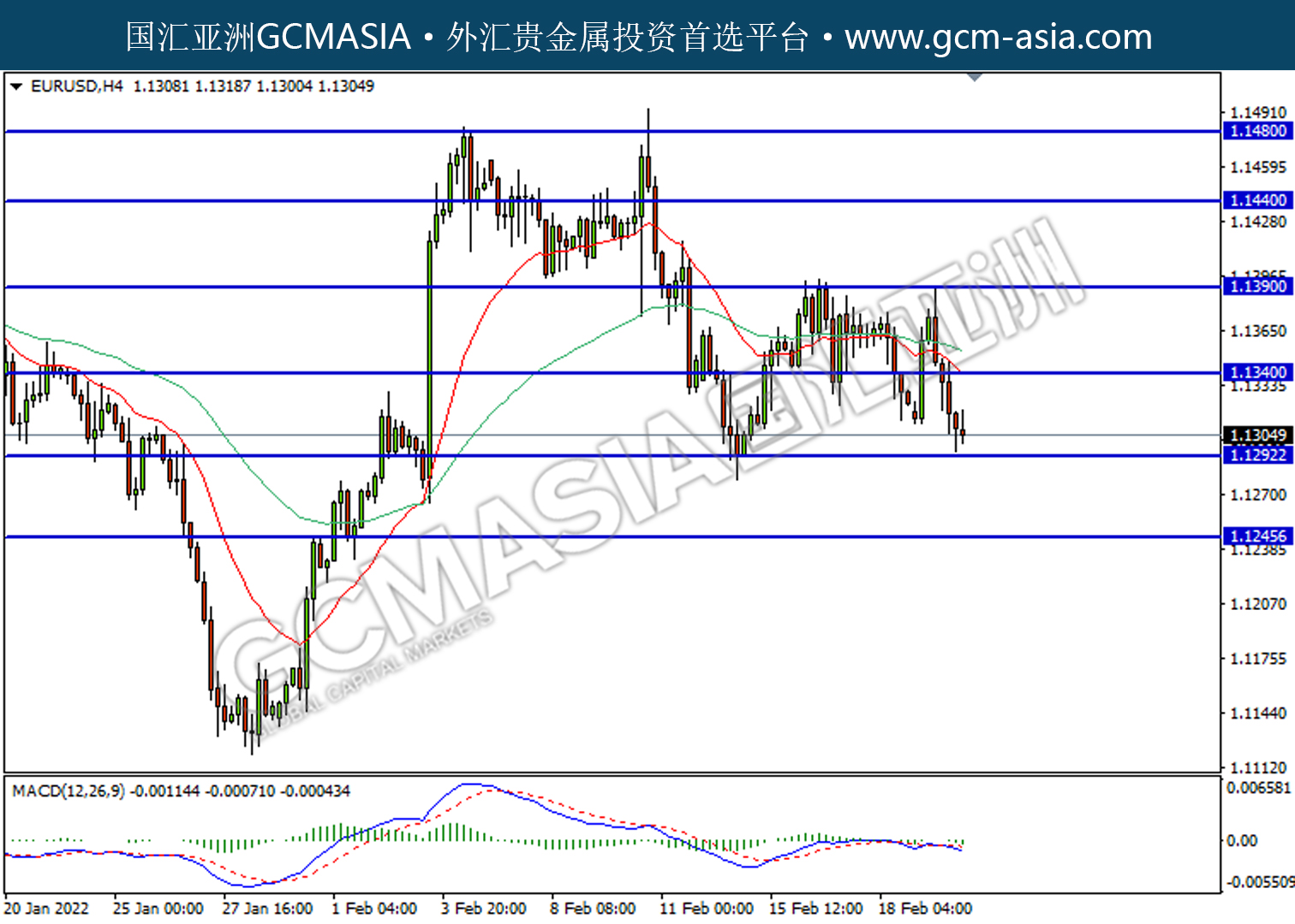 20220222 EURUSD by willy | Feb 22, 2022 | 欧元兑美元 | 0 comments EURUSD,H4:欧美受承压回落。MACD已形成死叉,动能转弱,短期关注空头为主。上方关注1.1340压力和1.1390压力,下方关注1.1290支撑和1.1245支撑。