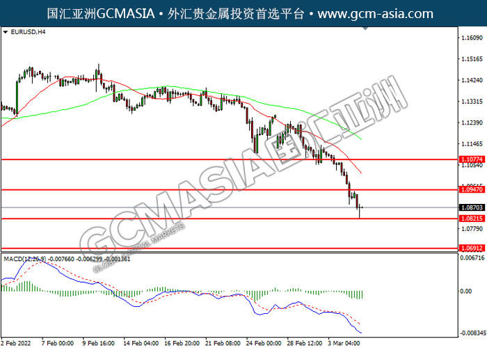 20220307 EURUSD-午间 by willy | Mar 7, 2022 | 欧元兑美元 | 0 comments EURUSD, H4: 欧美震荡下行,目前测试前期支撑。MACD空头动能略增,若下破可关注空头为主。上方关注1.0945压力和1.1075压力,下方关注1.0820支撑和1.0690支撑。