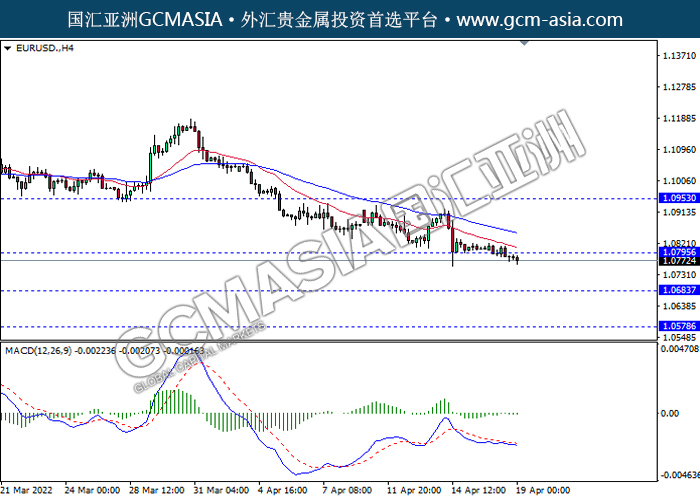 20220419 EURUSD-午间 by willy | Apr 19, 2022 | 欧元兑美元 | 0 comments EURUSD,H4:欧美跌破前期支撑,震荡下行。然而,MACD空头动能略减,短期可关注技术性回调为主。上方关注1.0795压力和1.0955压力,下方关注1.0685支撑和1.0580支撑。