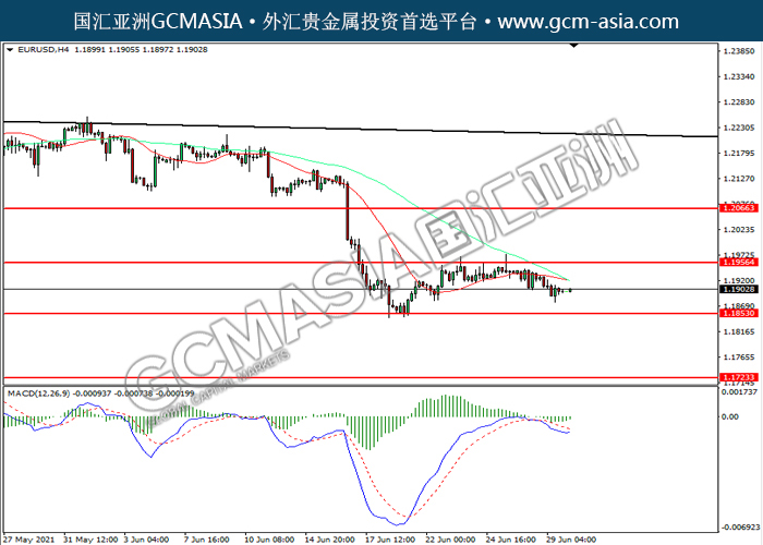 300621 EURUSD by willy | Jun 30, 2021 | 欧元兑美元 | 0 comments EURUSD,H4: 欧美震荡下行。然而,MACD空头动能略减,短期可关注技术性回调为主。上方关注1.1955压力和1.2065压力,下方关注1.1855支撑和1.1725支撑。