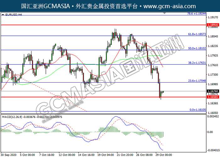 301020 EURUSD by willy | Oct 30, 2020 | 欧元兑美元 | 0 comments GCMAsia-EURUSD EURUSD 2020-10-30 EURUSD,H4:欧美低位反弹。MACD空头动能略减,短期可关注多头为主。上方关注1.1705压力和1.1765压力,下方关注1.1655支撑和1.1610支撑。