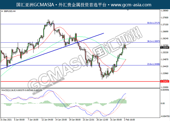030222 GBPUSD-午间 by willy | Feb 3, 2022 | 英镑兑美元 | 0 comments GBPUSD,H4:镑美震荡上行。然而,MACD多头动能略减,短期可关注技术性回调为主。上方关注1.3595压力和1.3715压力,下方关注1.3450支撑和1.3340支撑。