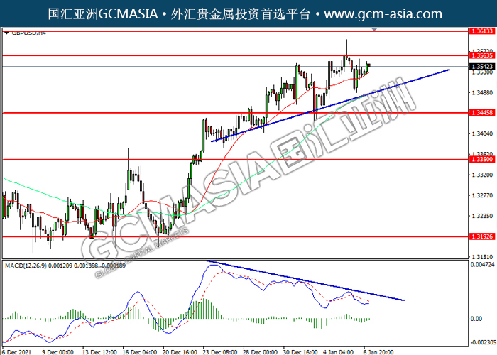 070122 GBPUSD-午间 by willy | Jan 7, 2022 | 英镑兑美元 | 0 comments GBPUSD,H4:镑美震荡上行,目前测试前期压力。MACD空头动能略减,短期关注多头为主。上方关注1.3565压力和1.3615压力,下方关注1.3445支撑和1.3350支撑。