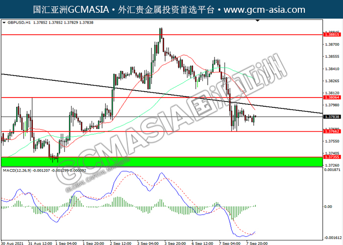 20210908 GBPUSD by willy | Sep 8, 2021 | 英镑兑美元 | 0 comments GBPUSD,H1:镑美震荡上行。MACD空头动能略减,短期可关注多头为主。上方关注1.3805压力和1.3880压力,下方关注1.3765支撑和1.3735支撑。