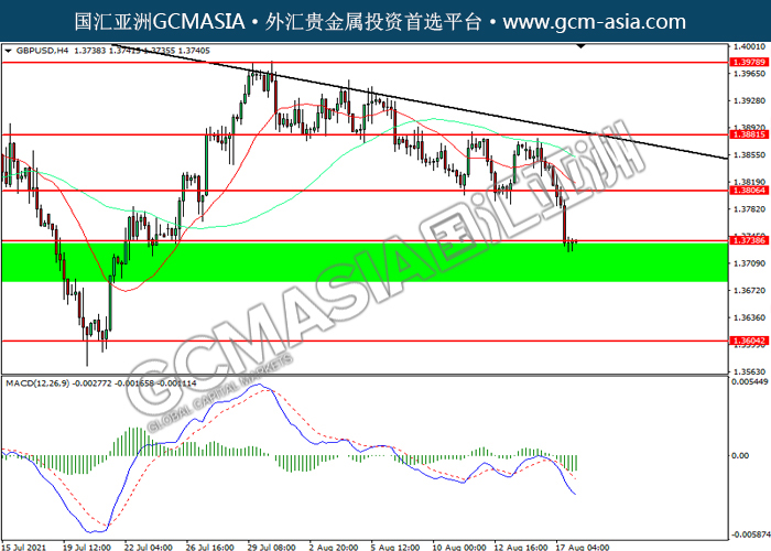 20210818 GBPUSD by willy | Aug 18, 2021 | 英镑兑美元 | 0 comments GBPUSD,H4:镑美高位回落,目前测试前期支撑。MACD空头动能略增,若下破可关注空头为主。上方关注1.3805压力和1.3880压力,下方关注1.3740支撑和1.3605支撑。