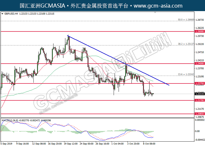 20191010 GBPUSD by willy | Oct 9, 2019 | 英镑兑美元 | 0 comments GCMAsia - GBPUSD GBPUSD 2019-10-10 GBPUSD,H4:镑美震荡盘整。MACD空头动能有所略减,短期关注多头回调。上方关注1.2275压力和1.2325压力,下方关注1.2170支撑和1.2085支撑。
