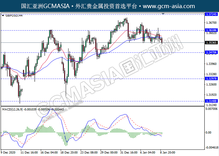 20210111 GBPUSD by keyk | Jan 11, 2021 | 英镑兑美元 | 0 comments GCMAsia-GBPUSD GBPUSD 2021-01-11 GBPUSD,H4:镑美高位承压回落。MACD动能持续略减,短期继续看空方向为主。上方关注1.3620压力和1.3725压力,下方关注1.3470支撑和1.3295支撑。