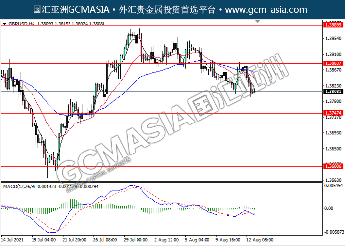 20210813 GBPUSD-午间 by keyk | Aug 13, 2021 | 英镑兑美元 | 0 comments GBPUSD,H4:镑美近期高位承压回落。MACD形成死叉,动能略减,短期继续看空回调为主。上方关注1.3885压力和1.3990压力,下方关注1.3745支撑和1.3600支撑。
