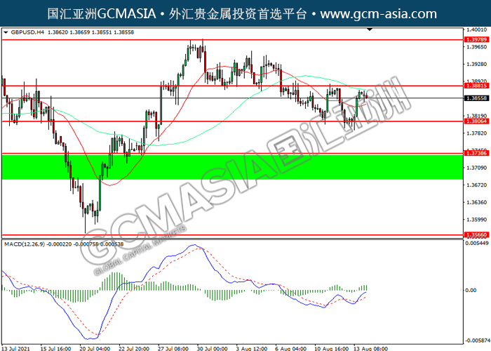 20210816 GBPUSD by willy | Aug 16, 2021 | 英镑兑美元 | 0 comments GBPUSD,H4:镑美低位反弹,目前测试前期压力。MACD多头动能略增,若突破可关注多头为主。上方关注1.3880压力和1.3980压力,下方关注1.3805支撑和1.3740支撑。