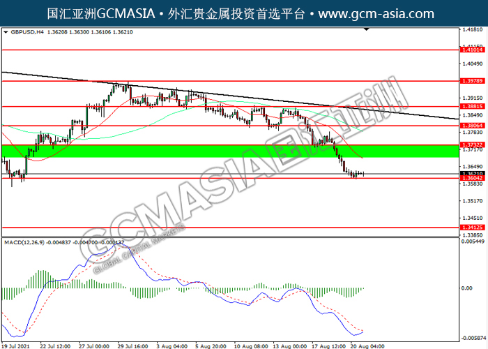 20210823 GBPUSD by willy | Aug 22, 2021 | 英镑兑美元 | 0 comments GBPUSD,H4:镑美震荡下行,目前测试前期支撑。然而,MACD空头动能略减,短期可关注技术性回调为主。上方关注1.3730压力和1.3805压力,下方关注1.3605支撑和1.3415支撑。