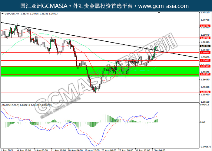 20210903 GBPUSD by willy | Sep 3, 2021 | 英镑兑美元 | 0 comments GBPUSD,H4:镑美突破前期压力,震荡上行。MACD多头动能略增,短期可关注空头为主。上方关注1.3880压力和1.3940压力,下方关注1.3805支撑和1.3765支撑。