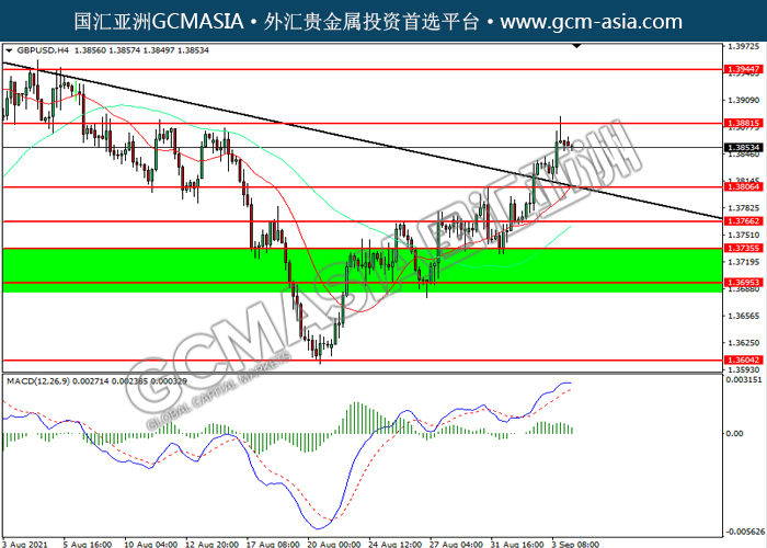 GBPUSD,H4:镑美突破前期压力,震荡上行。然而,MACD多头动能略减,短期可关注技术性回调为主。上方关注1.3880压力和1.3945压力,下方关注1.3805支撑和1.3765支撑。