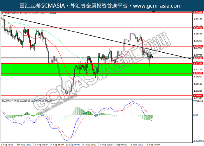 20210909 GBPUSD by willy | Sep 9, 2021 | 英镑兑美元 | 0 comments GBPUSD,H4:镑美震荡下行,目前测试前期支撑。然而,MACD空头动能略减,短期可关注技术性回调为主。上方关注1.3805压力和1.3880压力,下方关注1.3760支撑和1.3735支撑。