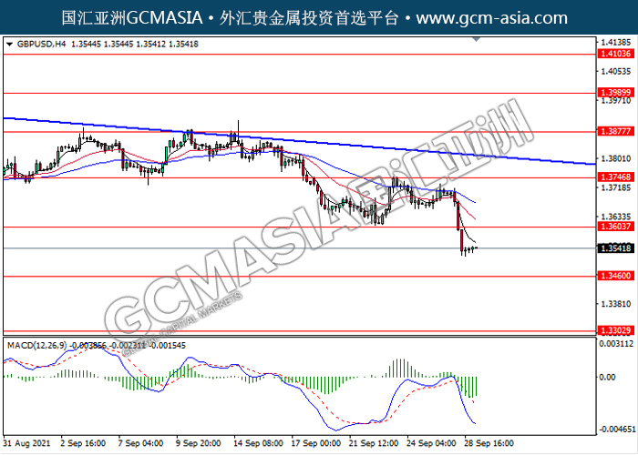 GBPUSD,H4:镑美突破前期支撑,空头排列。然而,MACD空头动能略增,短期关注技术性多头反弹为主。上方关注1.3605压力和1.3745压力,下方关注1.3460支撑和1.3300支撑。
