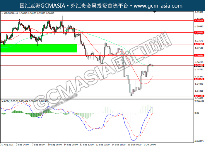 20211005 GBPUSD by keyk | Oct 5, 2021 | 英镑兑美元 | 0 comments GBPUSD,H4:镑美震荡上行。MACD多头动能略增,短期可关注多头为主。上方关注1.3605压力和1.3665压力,下方关注1.3515支撑和1.3415支撑。