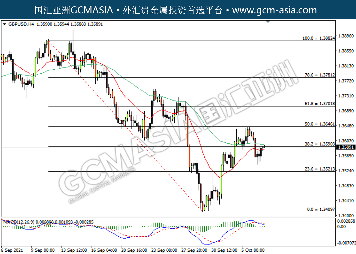 GBPUSD,H4:镑美低位反弹。MACD空头动能有所略减,若上破可继续看多为主。上方关注1.3590压力和1.3645压力,下方关注1.3520支撑和1.3410支撑。