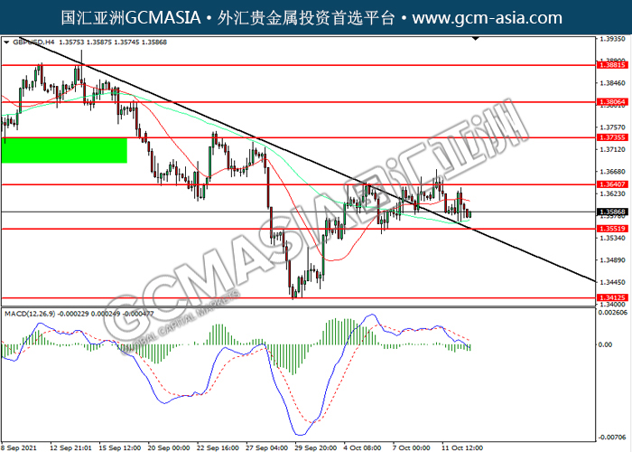 20211013 GBPUSD by willy | Oct 13, 2021 | 英镑兑美元 | 0 comments GBPUSD,H4:镑美震荡下行。MACD空头动能略增,短期可关注空头为主。上方关注1.3640压力和1.3735压力,下方关注1.3550支撑和1.3415支撑。