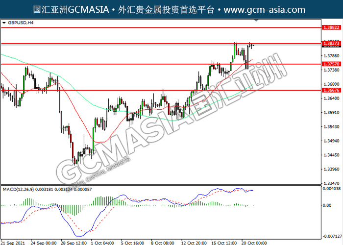 20211021 GBPUSD by willy | Oct 21, 2021 | 英镑兑美元 | 0 comments GBPUSD,H4:镑美震荡上行,目前测试前期压力。MACD多头动能略增,若突破可关注多头为主。上方关注1.3825压力和1.3880压力,下方关注1.3760支撑和1.3665支撑。
