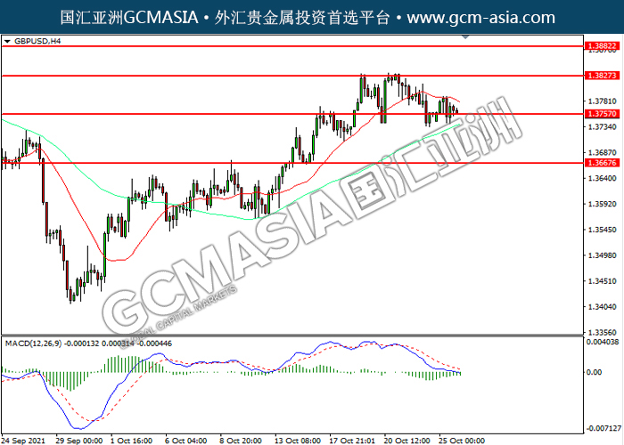 20211026 GBPUSD by willy | Oct 26, 2021 | 英镑兑美元 | 0 comments GBPUSD,H4:镑美震荡下行,目前测试前期支撑。然而,MACD空头动能略减,短期可关注技术性回调为主。上方关注1.3825压力和1.3880压力,下方关注1.3755支撑和1.3665支撑。
