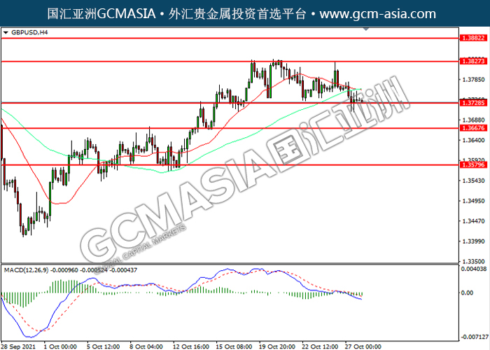 20211028 GBPUSD by willy | Oct 28, 2021 | 英镑兑美元 | 0 comments GBPUSD,H4:镑美震荡下行,目前测试前期支撑。MACD空头动能略增,若下破可关注空头为主。上方关注1.3825压力和1.3880压力,下方关注1.3730支撑和1.3665支撑。